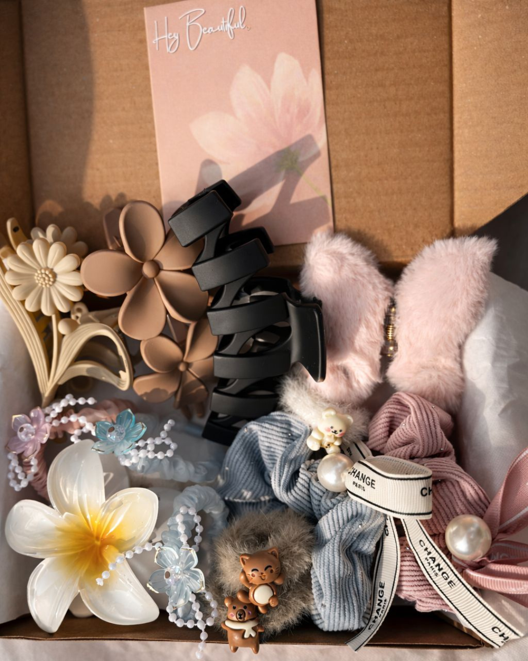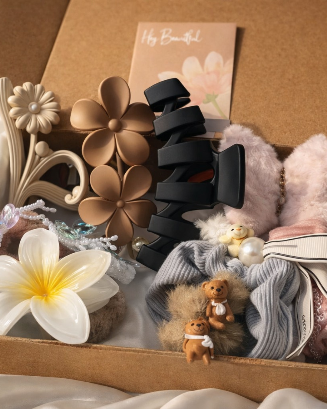 Auravya Hair Essentials Set is a curated gift hamper box featuring Pack of 5 Clips (1 butterfly fur claw clip , 1 blooming flower hair clutcher , 1 zig zag large hair claw clip , 1 daisy styled hair claw clip , 1 matte double flower hair clip) + 2 Cotton Scrunchies + Unlimited Freebies and floral accessories. A perfect gift hamper for girls and gift hampers for women, ideal as a New Year 2026 gift hamper. Shop this new year gift hamper online during our New Year Sale.