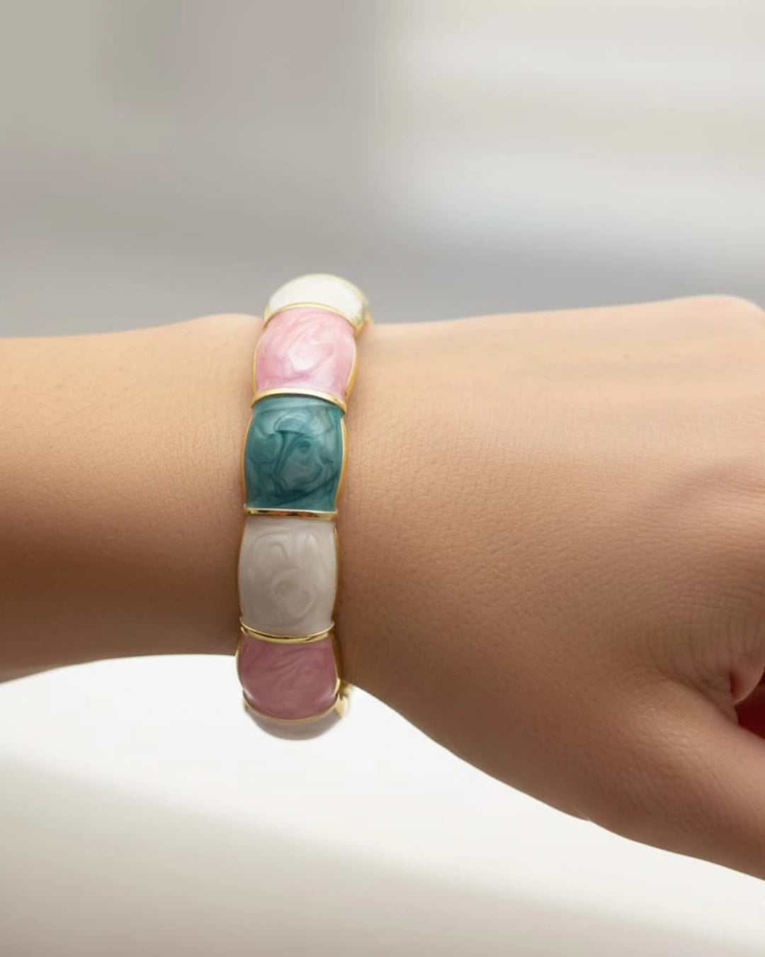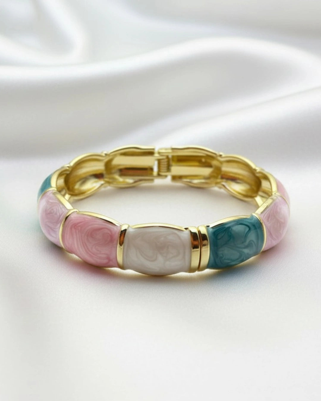 Blush and Teal Harmony Bracelet, a refined piece designed for modern styling. Blending pastel blush and teal tones with a polished gold finish, this bracelet stands out among trendy bracelets for ladies.